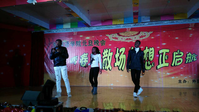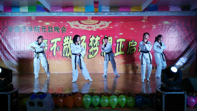 晚会在一段开场舞舞中拉开了帷幕,热情激昂的舞蹈洋溢着青春和活力,撒播着激情和梦想,瞬间调动了晚会的气氛。歌曲《慢慢》以浪漫的情调滋润了在场观众的心田。小品《修理工》和情景剧《纳新》语言幽默,动作滑稽,引得笑声连连。留学生Canai的一首中文歌曲《朋友》字正腔圆,曲调优美,博得阵阵掌声与喝彩,更诠释了中外学生间的友谊和关爱。古朴典雅的独舞《爱莲说》,刚劲有力的中国功夫,留学生Christian、Mukamba、Marata等演绎的原声歌曲I Gotta Feeling及颇具异域风情的伴舞等更是展现了多元的文化色彩,将晚会推向了高潮。晚会在歌曲《Jingle Bells》欢快喜庆的旋律中落下帷幕,表达了外国语学院对充满青春活力、胸怀梦想的学子深深的祝福及全体师生对新的一年美好的希冀。