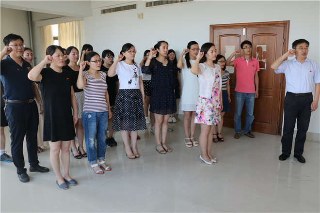 为深入开展“两学一做”学习教育,庆祝中国共产党成立95周年,6月22日下午,外国语学院全体教工党员、学生党员同时在日照校区1270党建活动室和济宁校区730会议室开展了“佩戴党徽、重温誓词”宣誓仪式主题党日活动。外国语学院党总支书记王传功带领日照校区全体教工党员和学生党员佩戴党徽,庄重地举起右手,面对鲜红的党旗,进行了庄严地入党宣誓,重温入党誓词。外国语学院济宁校区师生党员同时进行了宣誓。宣誓后,两校区党员分别学习了党员的权力、党员的义务,希望广大党员同志认真履行党员义务,正确行使党员权力,做一名合格党员,把“两学一做”活动同推进学院各项工作的开展紧密结合起来。