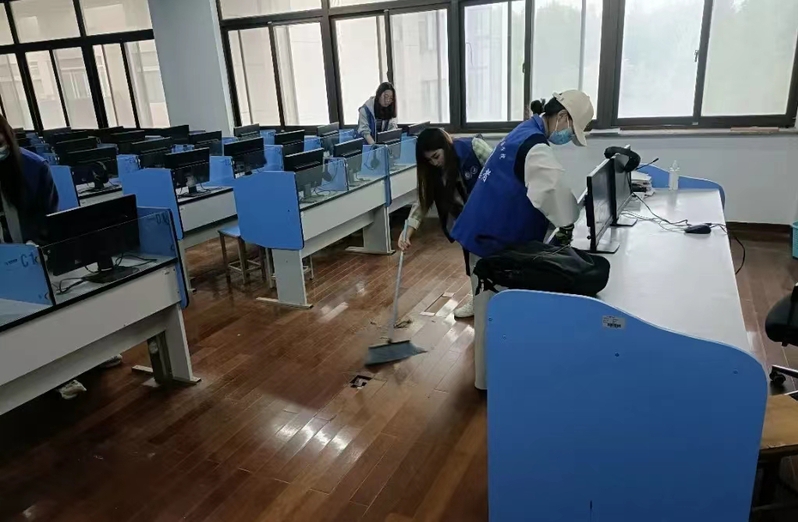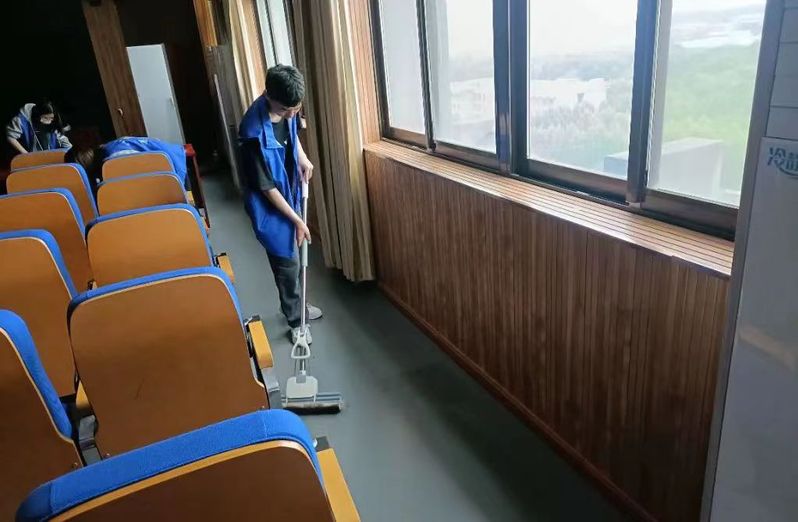 志愿者们分工明确,密切配合,干劲十足,对语音室和会议室等教学场所的桌椅、讲台、窗户、地面等卫生区进行重点清洁工作。活动过程中,志愿者手拿扫帚、拖把、抹布等卫生工具认真清扫每个角落,确保不留死角。经过大家的辛勤劳动,教学区域窗明几净,焕然一新,为广大师生营造了一个干净而舒适的学习环境。