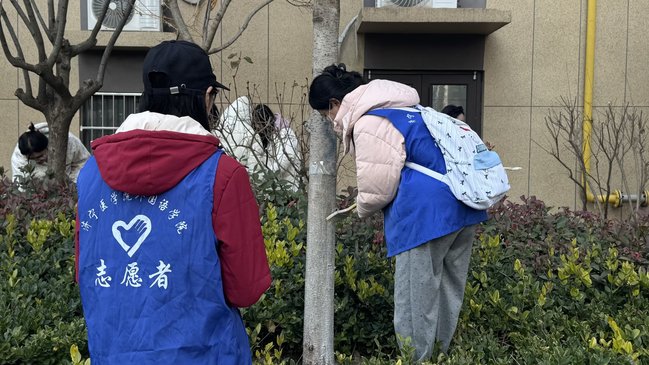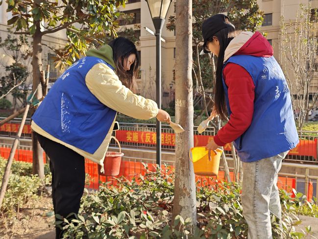 在社区网格员的指导下,学院党团骨干聚焦文明城市创建,对社区主干道及公共绿地的乔灌木进行逐株排查,清理树皮并细致涂刷树干,形成高度整齐、均匀统一的“白色防护带”。针对以往虫害较多的树木,志愿者们采取二次加厚涂刷,并悬挂黄色黏虫板,切实提升树木抗病虫害能力,从而维护社区生态健康。