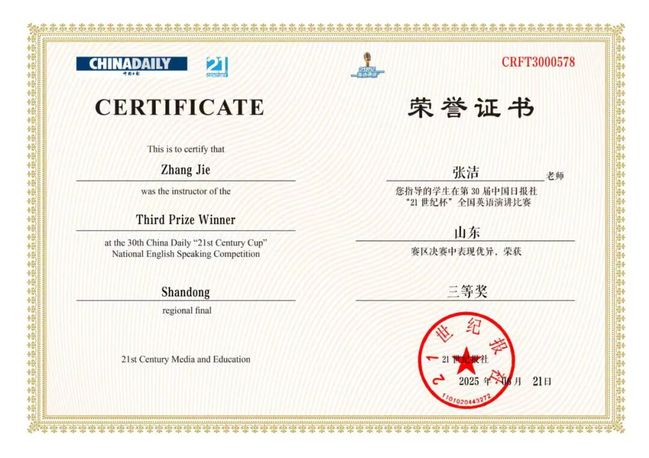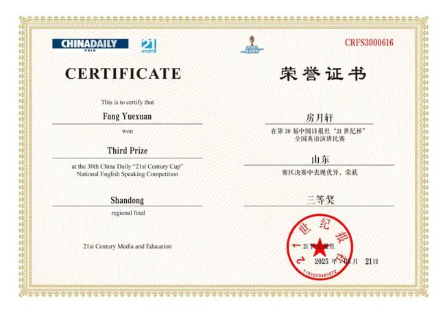 学院以“优中选优、对接高阶”为目标,搭建校级英语演讲竞赛平台,通过“校赛锤炼——省赛突破”的进阶模式,着力培育学生用外语叙事中国、传播思想的卓越能力。经过精心指导与层层选拔,临床医学院2022级学生房月轩代表学校参加第三十届“21世纪杯”全国英语演讲比赛山东赛区决赛。在省赛舞台上,她凭借流利的表达、缜密的逻辑,将医学专业与“健康中国”战略深度融合,最终荣获三等奖,指导教师张洁获评“优秀指导教师”。
