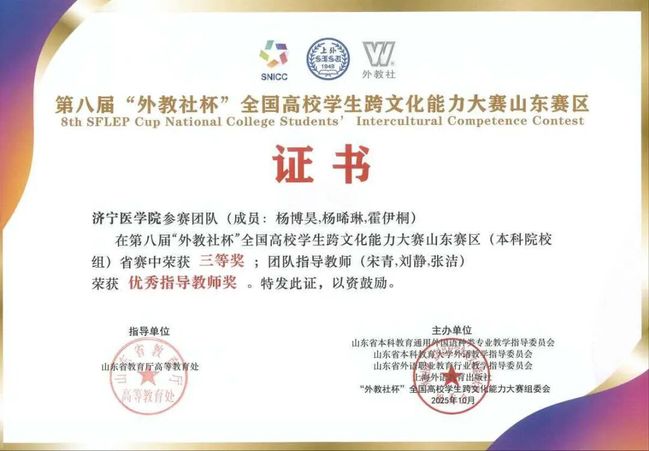 学院以培养复合型人才为导向,举办第八届“外教社杯”全国高校学生跨文化能力大赛校园选拔赛,积极推动学科交叉与团队协作。在宋青、刘静、张洁三位老师的悉心指导下,由临床医学院杨博昊、口腔医学院杨晞琳等同学组成的跨学院团队,在面对跨国医疗协作等复杂情境时,充分发挥外语能力、医学专业知识及跨文化素养,精准分析问题并提出切实有效的解决方案,最终荣获省级本科院校组三等奖。这一成绩充分彰显了学院“外语+专业+跨文化素养”人才培养模式的实践成果与显著育人实效。